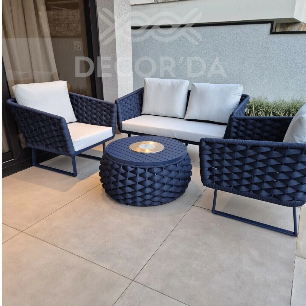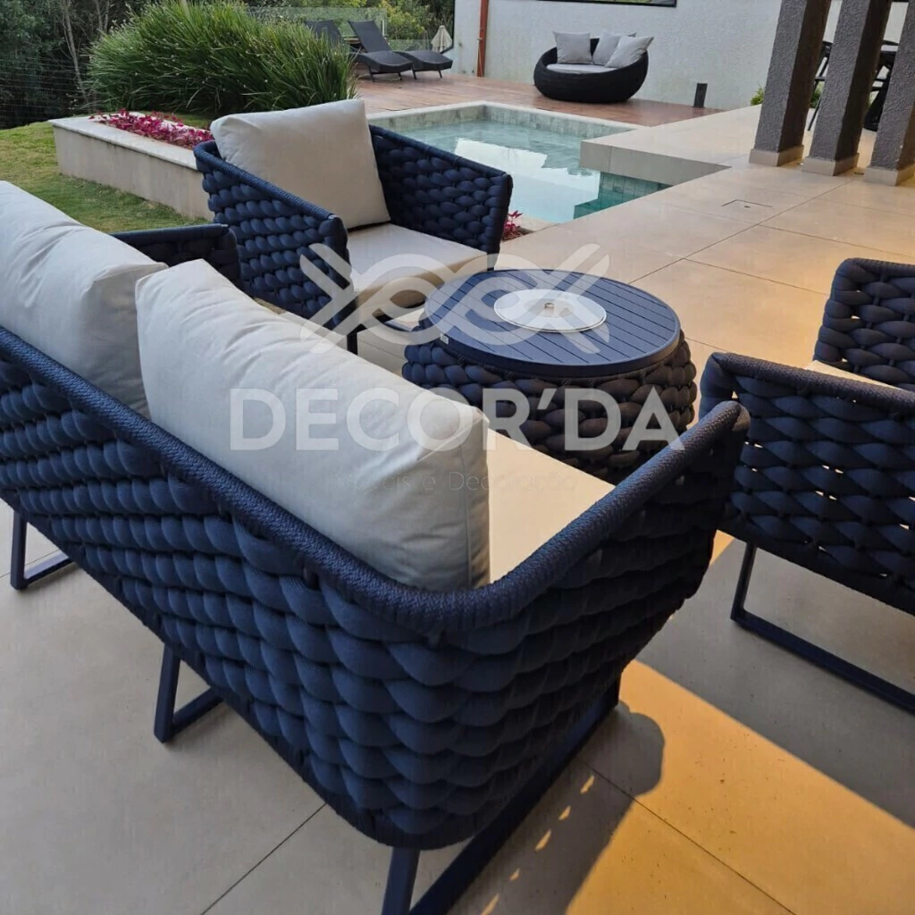Dê um salto de estilo à sua área gourmet externa com o Conjunto Dubai em Tricô Náutico, uma peça premium que traz autenticidade e charme para varandas, jardins ou terraços.