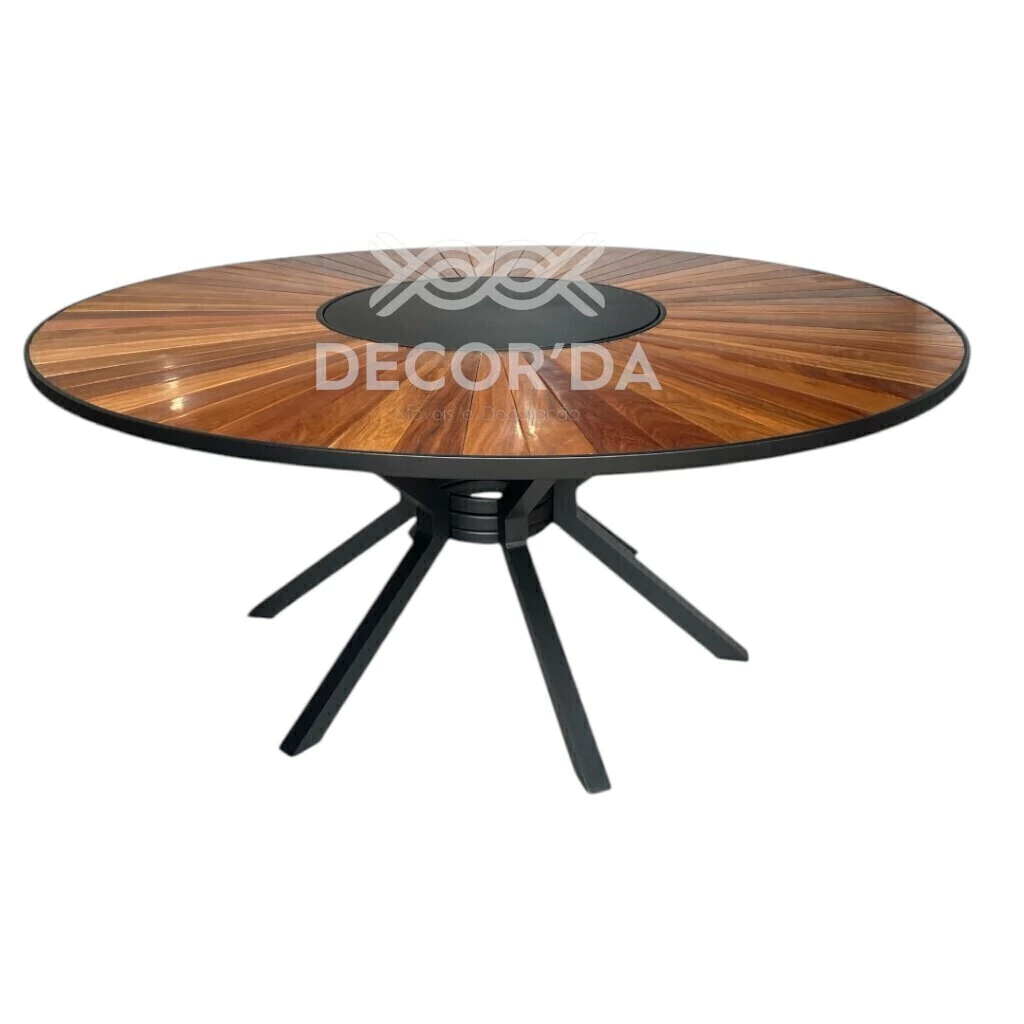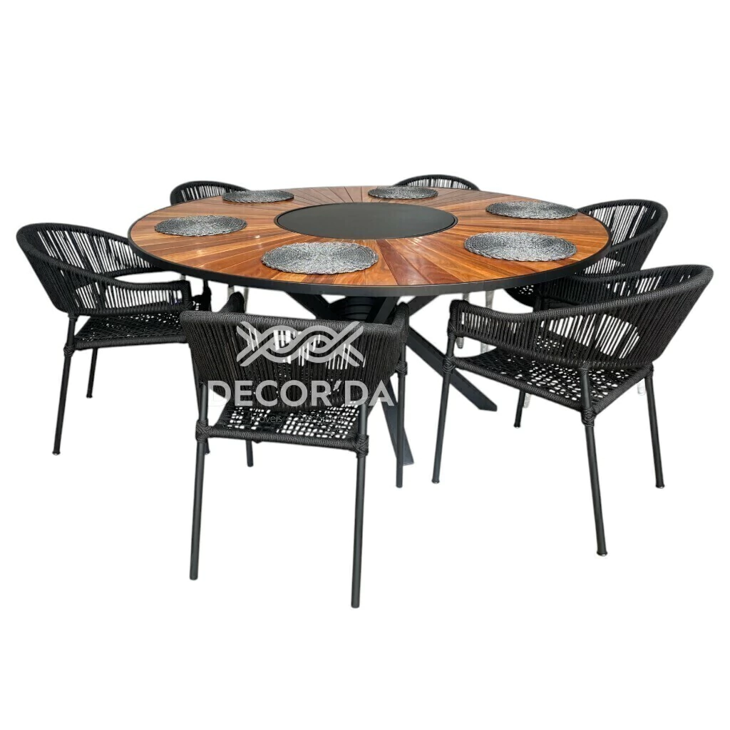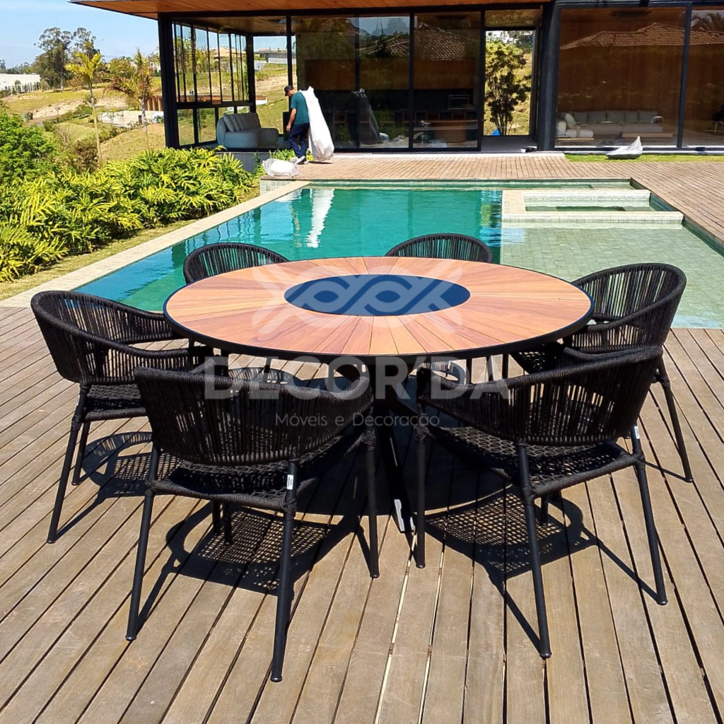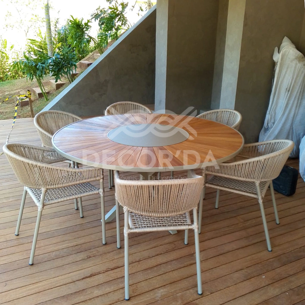 O tampo da mesa Estrela em Madeira Cumaru de alta qualidade traz beleza natural, enquanto o centro giratório facilita servir e compartilhar alimentos. A base em alumínio confere durabilidade e leveza visual. As cadeiras Liz apresentam estrutura em alumínio e revestimento em corda náutica trançada, garantindo conforto, estilo e resistência ao uso externo..png)