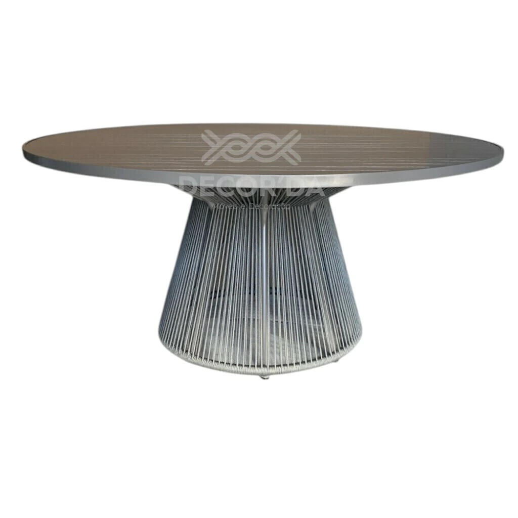 A mesa Mauá se destaca pelo tampo ripado em alumínio com acabamento refinado e estrutura resistente, perfeita para ambientes externos.