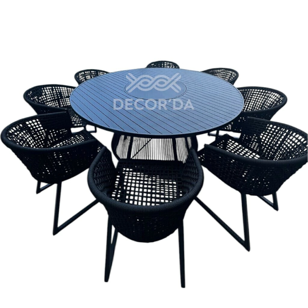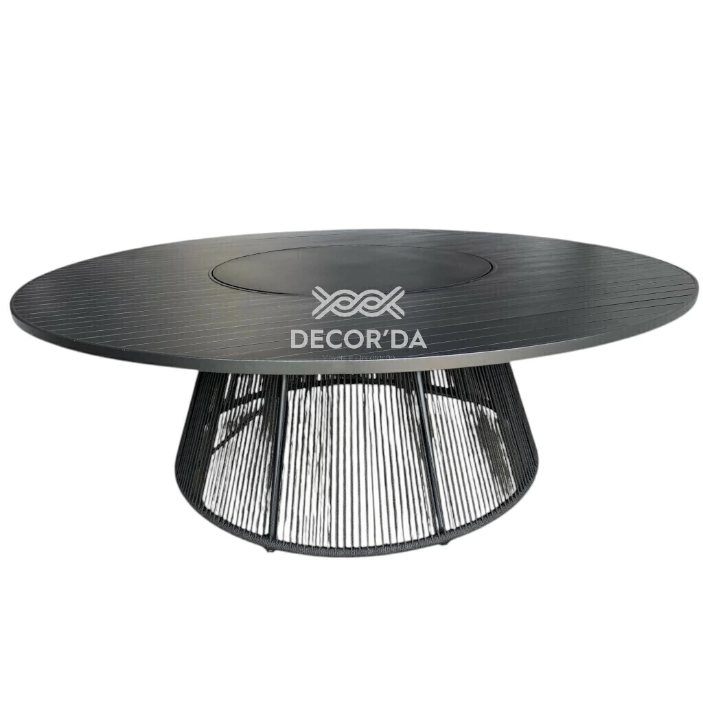 A mesa Mauá traz um tampo ripado em alumínio com centro giratório de alta durabilidade e acabamento impecável, aliado a uma estrutura robusta que garante estabilidade.