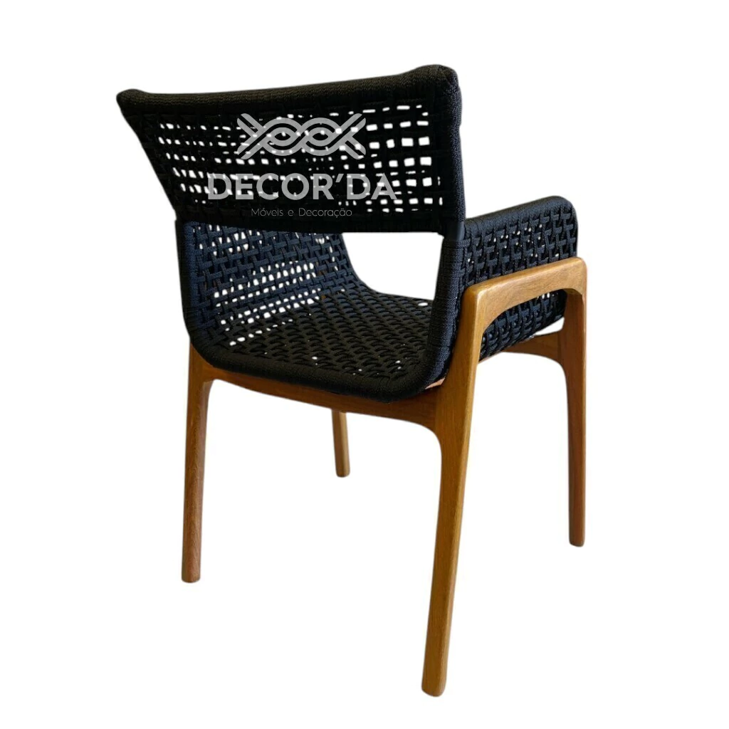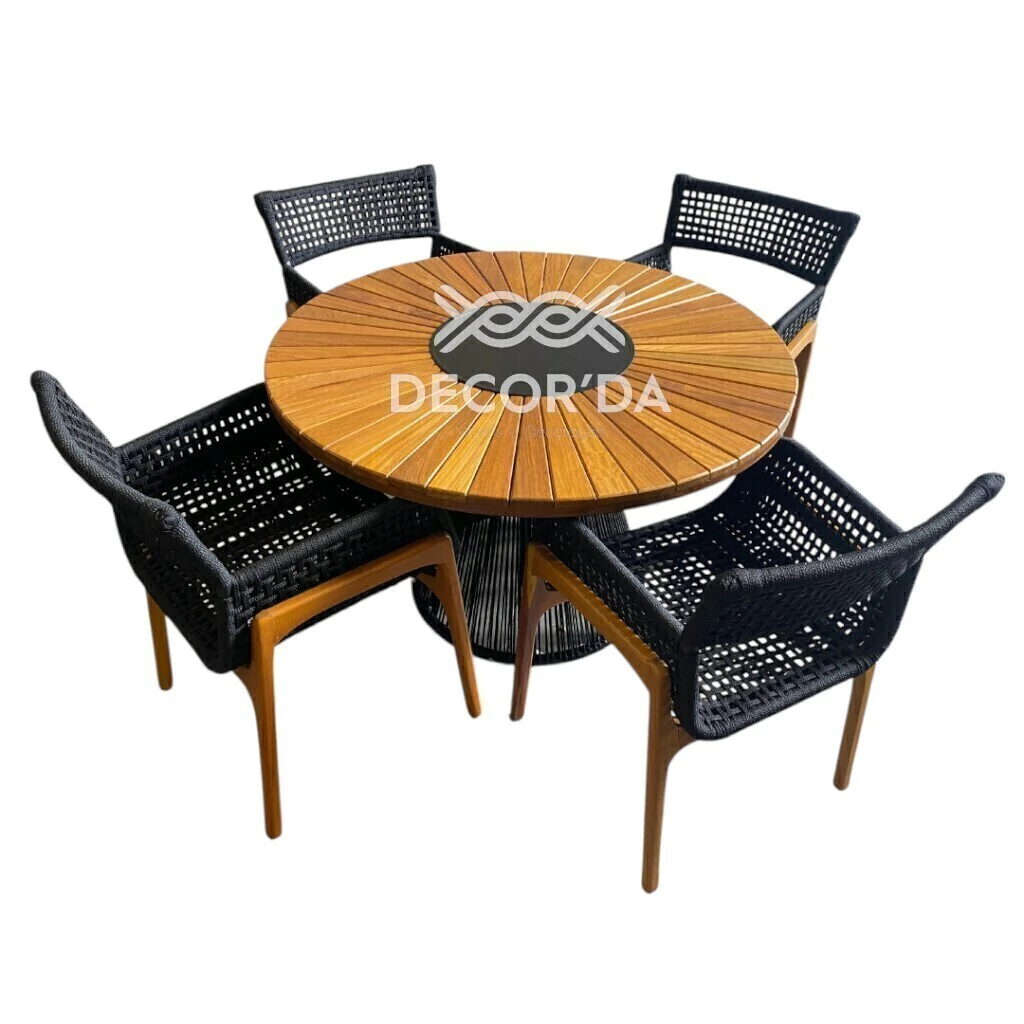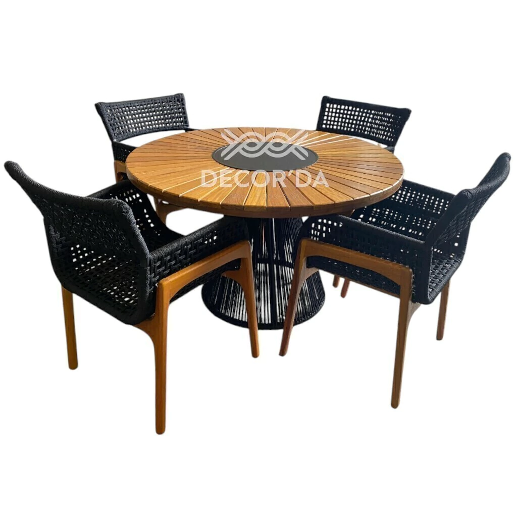 A mesa Mauá é construída em madeira Cumaru maciça, material valorizado por sua resistência natural às intempéries, enquanto o centro giratório embutido facilita servir e interagir à mesa. A base conta com alumínio e detalhes com corda náutica para reforçar leveza e durabilidade. As cadeiras Barcelona combinam conforto e visual refinado, com estrutura em madeira cumaru e acabamento refinado.