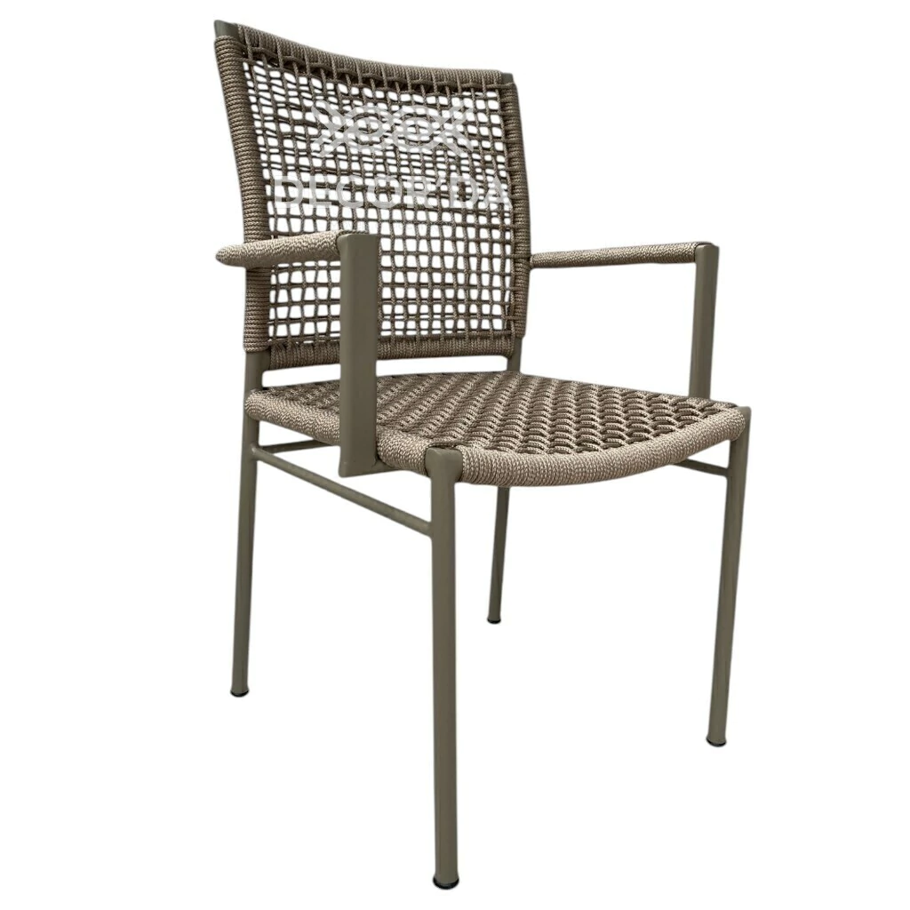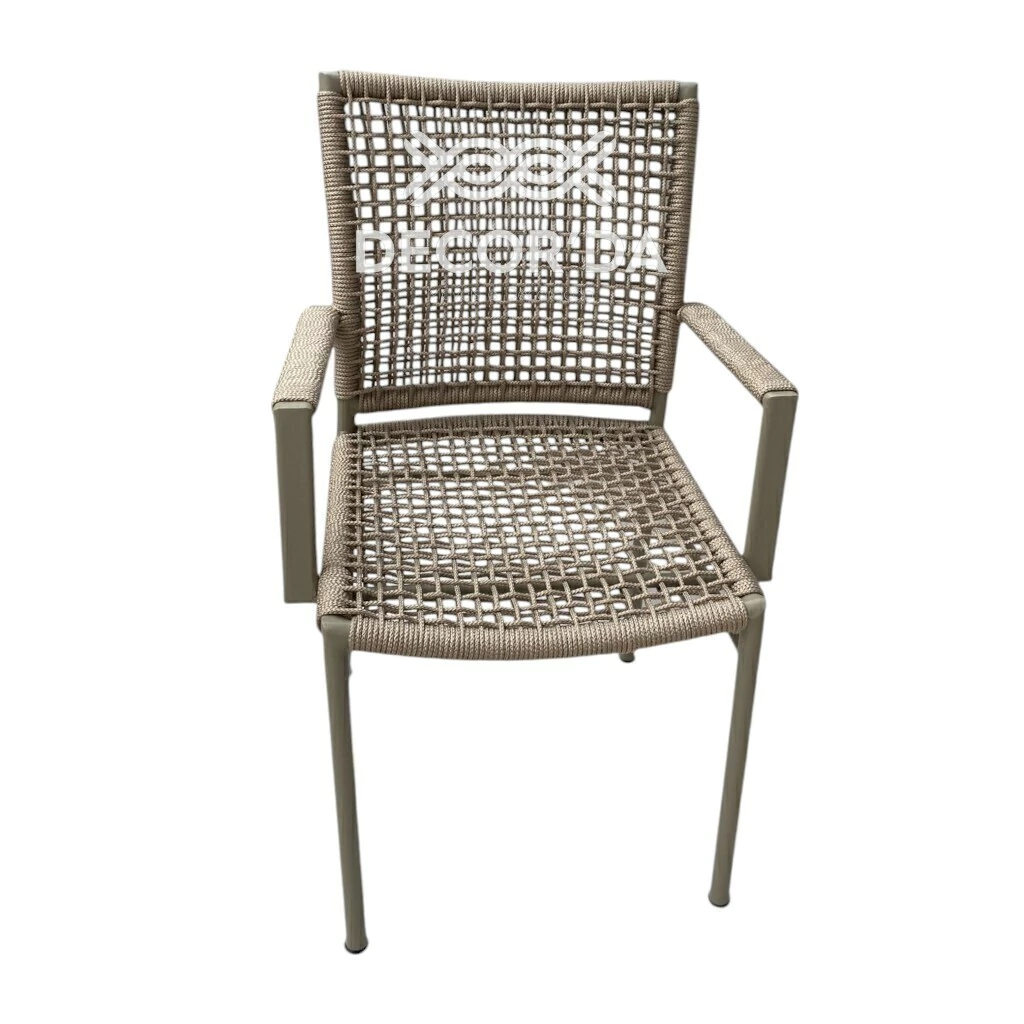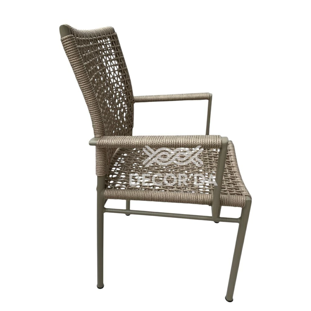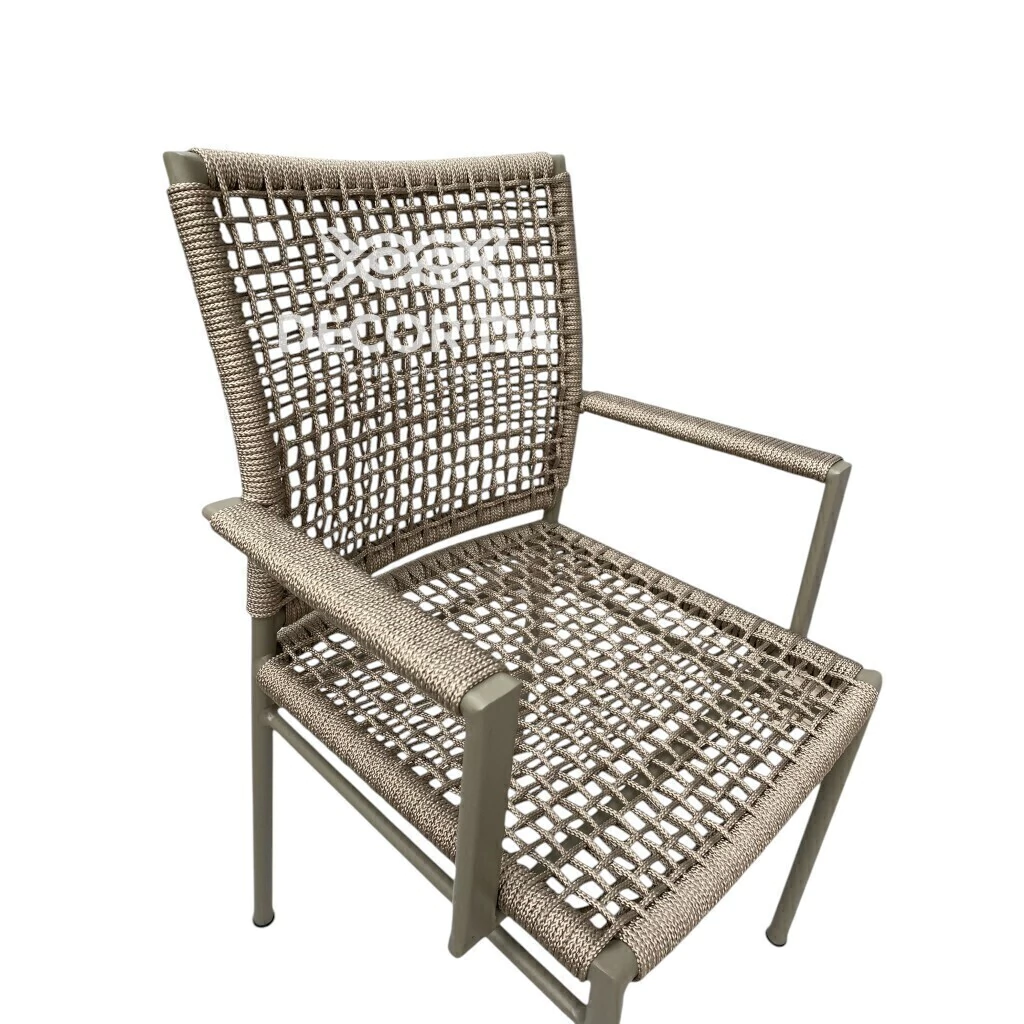 A mesa Estrela utiliza estrutura em alumínio de alta resistência, com acabamento que protege contra ferrugem e desgaste. Já as cadeiras Duna são revestidas em corda náutica trançada, um material resistente ao sol e à umidade, conferindo visual artesanal e ventilação confortável.