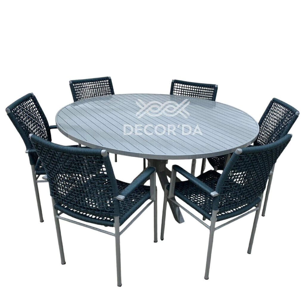 Impressione seus convidados com o Conjunto Mesa Estrela e Cadeiras Duna, uma composição sofisticada que harmoniza robustez e leveza para seu espaço externo.