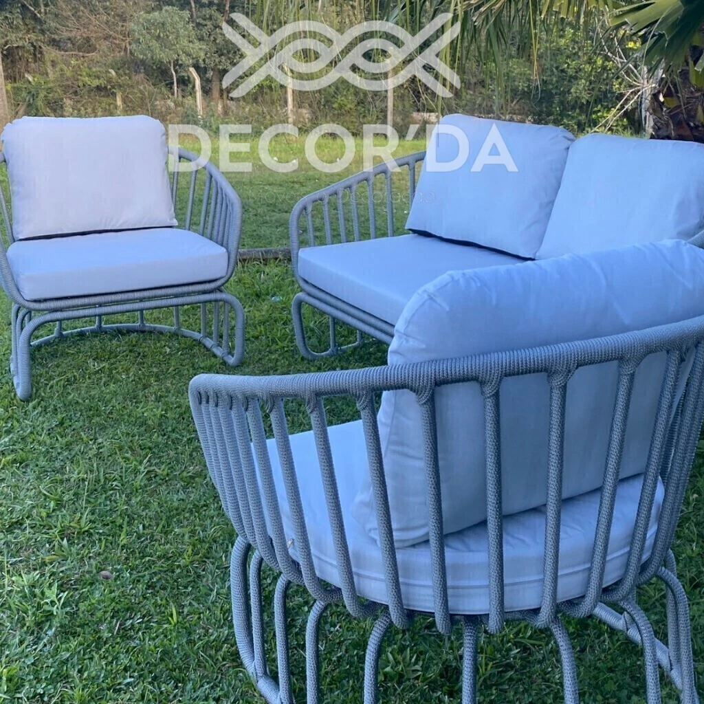 Dê vida nova ao seu espaço externo com o Conjunto Pérola, que une sofá e poltronas em corda náutica, entregando elegância, estilo e aconchego para varandas, jardins ou áreas gourmet.