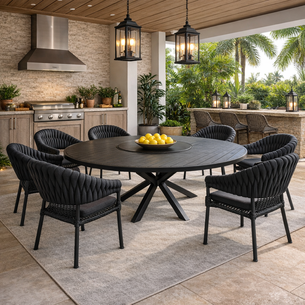 Transforme sua área externa ou espaço gourmet em um ambiente sofisticado e funcional com a Mesa Estrela em Alumínio com Centro Giratório, um design exclusivo.