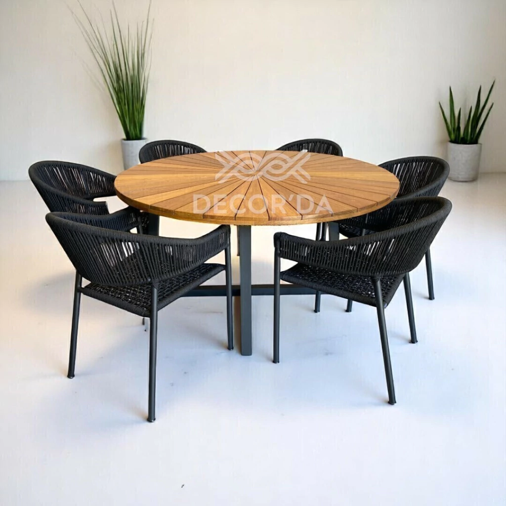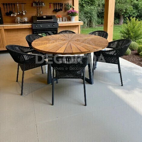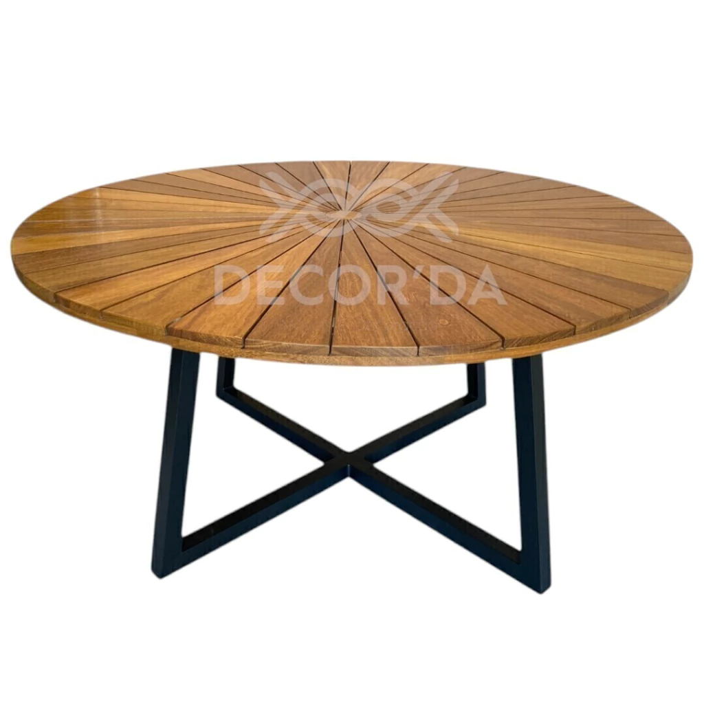 Conheça a Mesa Isis Redonda, um ícone de sofisticação para sua sala de jantar, varanda gourmet ou espaço corporativo, com tampo em madeira Cumaru acetinada e base em alumínio com pintura eletrostática.