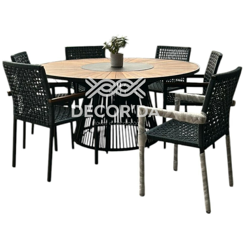 A mesa com tampo em madeira Cumaru com centro giratório, facilita o acesso aos pratos. Sua base é em alumínio leve com pintura eletrostática, envolvida por corda náutica à prova de intempéries, uma combinação de durabilidade e estilo.