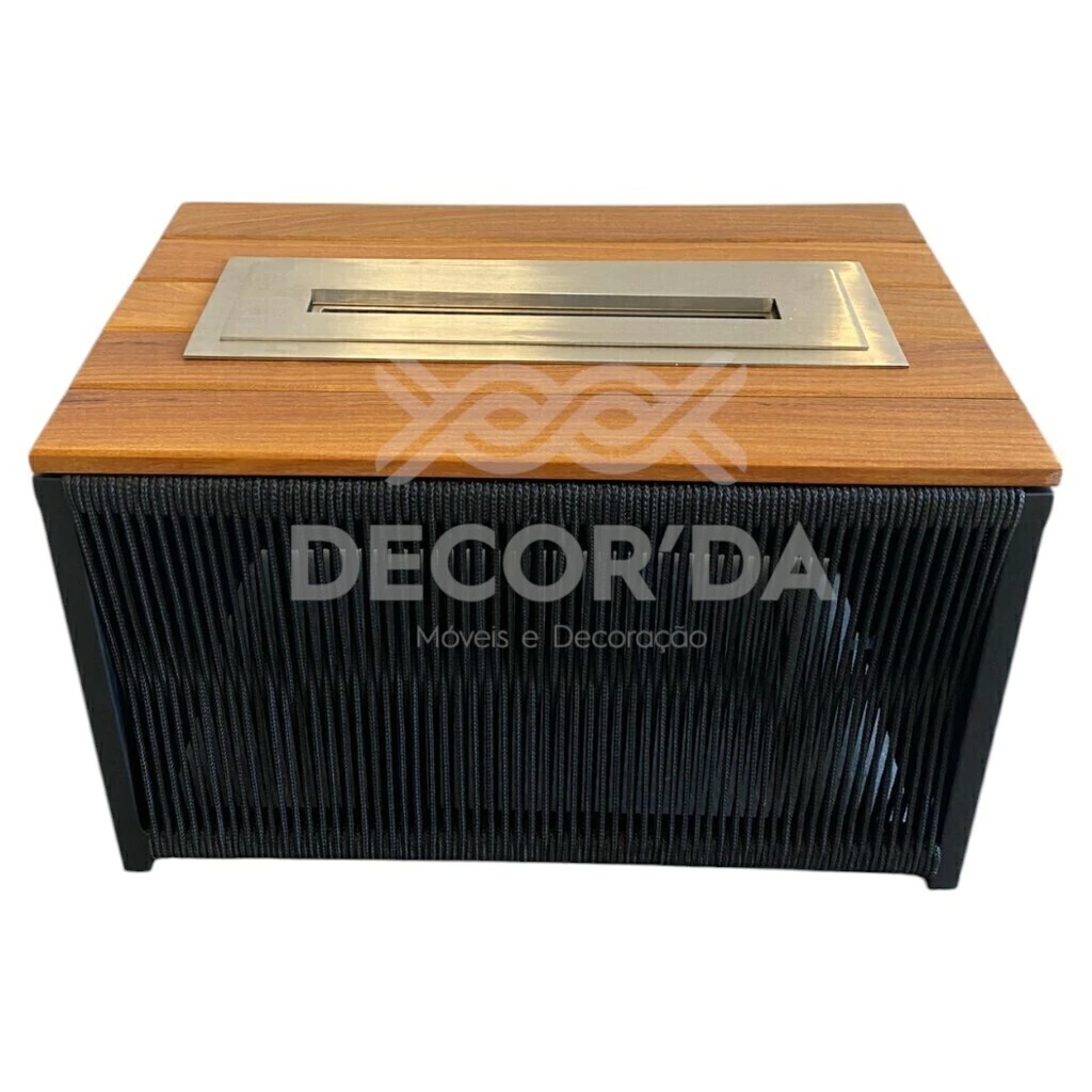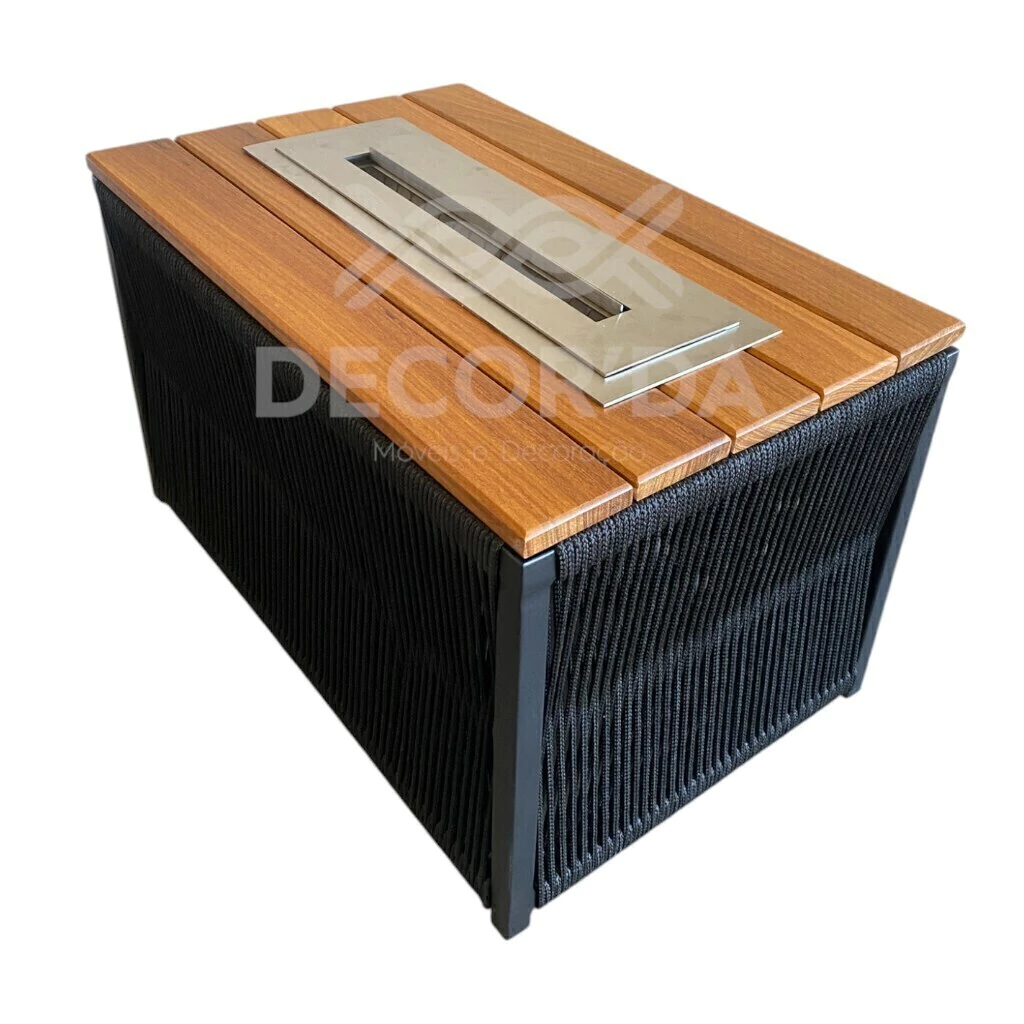 A estrutura é confeccionada em alumínio com pintura eletrostática, assegurando leveza e resistência ao tempo. O revestimento em corda náutica artesanal confere toque visual artesanal e durabilidade. Em seu tampo você encontra lareira ecológica a álcool com dupla função, que também se transforma em champanheira para bebidas geladas nos momentos de lazer.