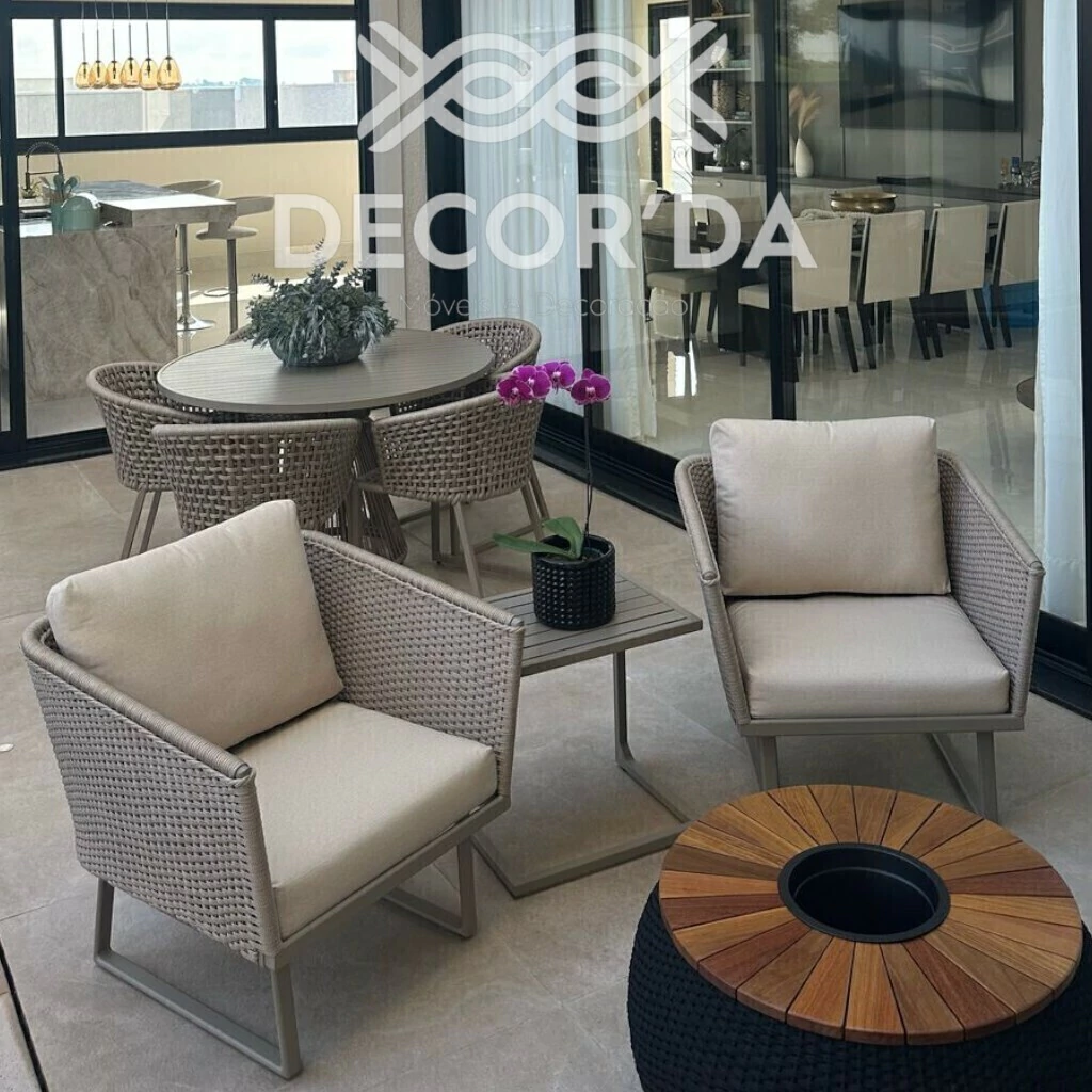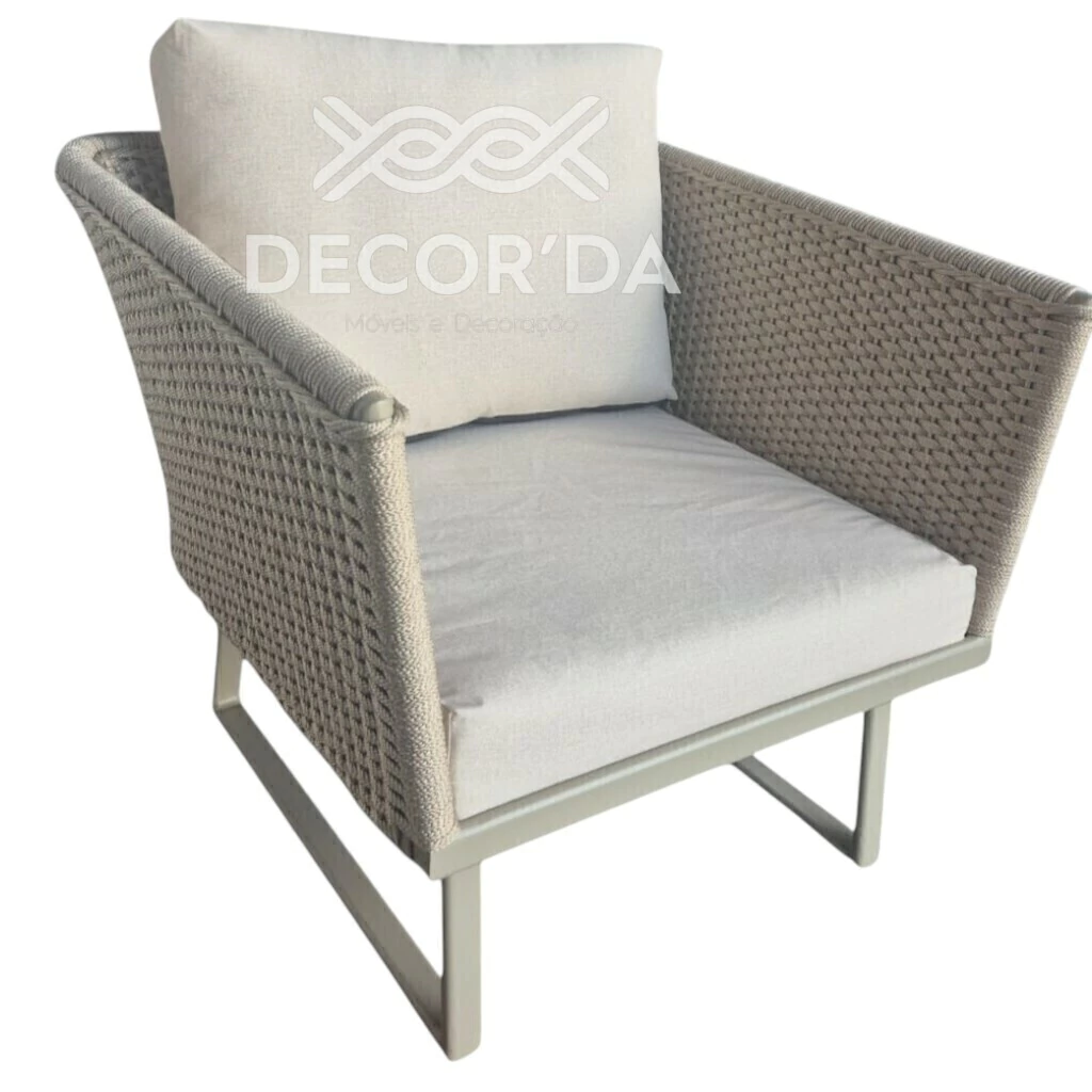 Com estrutura em alumínio tratado e acabamento em corda náutica trançada à mão, esta poltrona oferece resistência a sol, chuva e uso contínuo. O assento profundo com almofadas de espuma de alta densidade garante conforto por horas de uso.