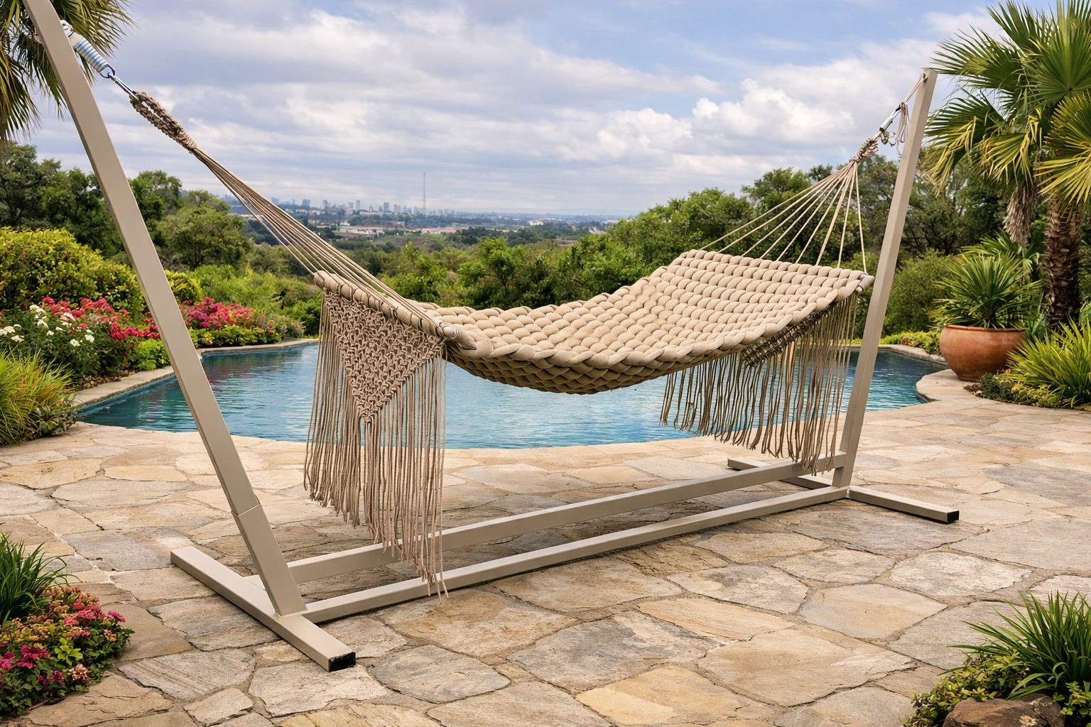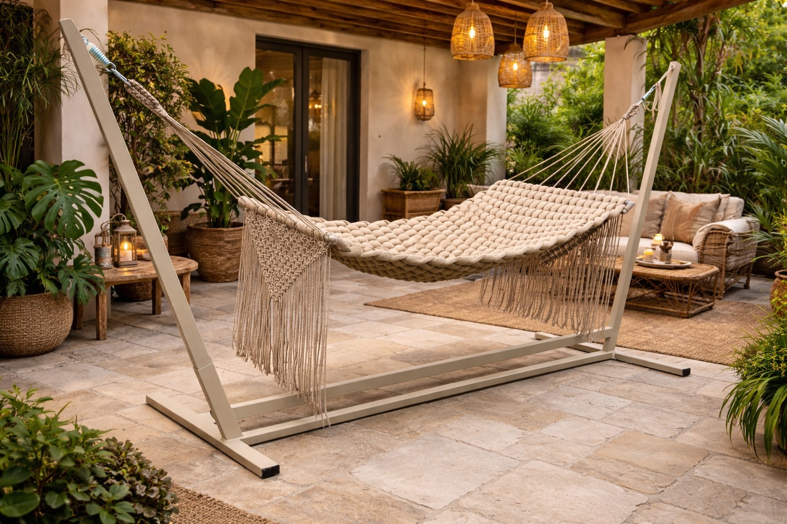 Transforme seu jardim ou varanda em um verdadeiro refúgio de descanso com a Rede em Tricô Náutico da Decorda Móveis, uma peça que une design sofisticado, conforto absoluto e materiais de alta durabilidade.